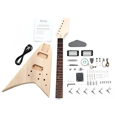 do-it-yourself electric guitar building kit, RR style Body: mahogany, neck: bolt-on mahogany, fingerboard: Blackwood Pickups: 2x humbucker, inlays: crown, die-cast tuners, color: natural Includes all necessary parts A certain amount of technical skill is required