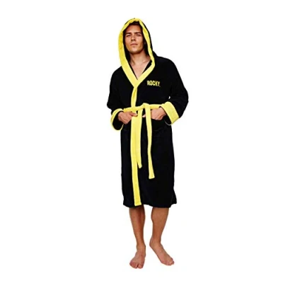 AmazonRocky Balboa logo on the front "Italian Stallion" and horse logo on the back 100% Polyester - Machine washable at 30 degrees Hooded mens dressing gown 2 front pockets and matching tie belt