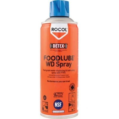 General description This food-grade WD spray is a non-toxic, water-displacing lubricant fortified with PTFE. It offers excellent anti-wear and lubricating properties, along with superior penetrating and cleaning performance. The formulation is silicone-free and safe for use in food, beverage, and pharmaceutical environments, providing outstanding corrosion protection. Technical specifications Container Type: Aerosol Operating Temperature Range: -50°C to +120°C Size: 300ml Features: Anti-wear, lubricating, penetrating, cleaning, PTFE fortified, silicone-free, corrosion protection, reduces plastic contamination risk Compatibility and accessories Compatible with food processing and pharmaceutical equipment Features Detex technology with x-ray and metal-detectable plastic aerosol caps and actuators to minimize contamination risk Installation Apply the spray directly to the desired surfaces or components using the aerosol can Ensure the area is clean and dry before application for optimal