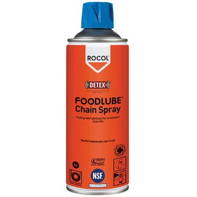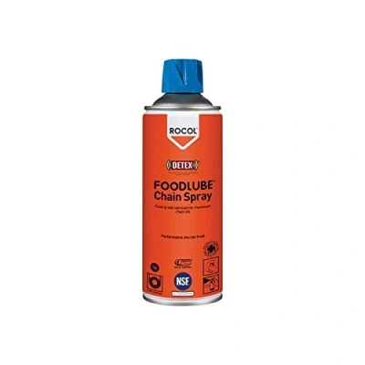 General description ROCOL FOODLUBE Chain Spray is a food-grade aerosol lubricant designed for chains, conveyors, pulleys, and rollers in food, pharmaceutical, and other clean environments. It penetrates into chain components such as pins and rollers to reduce wear and extend the lifespan of the chain. The spray forms a highly adhesive, water-resistant film that prevents drips and fling-off, ensuring effective lubrication even in challenging conditions. This product offers high thermal stability, resisting sludge formation and varnishing, and provides excellent corrosion protection. Technical specifications Type: Spray lubricant Size: 400ml Temperature resistance: -20°C to +150°C (short-term up to +180°C) Compatibility and accessories Suitable for all types of chains, conveyors, pulleys, and rollers used in food and pharmaceutical industries. Installation Shake the can well before use. Apply evenly to the chain or moving parts from a suitable distance. Ensure thorough coverage for