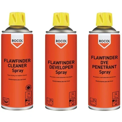 General description ROCOL FLAWFINDER is a non-destructive inspection system designed for fast and reliable visual detection of cracks or flaws that are not visible to the naked eye. It is ideal for inspecting welded joints, castings, forgings, and more. The system is portable, easy to use, and cost-effective, making it a recognized non-destructive testing (NDT) solution in industrial applications. Technical specifications FLAWFINDER Cleaner Spray: 300ml FLAWFINDER Developer Spray: 400ml FLAWFINDER Dye Penetrant: 300ml Manufacturer Part Number (MPN): ROC63181 EAN: 5024747631810 Other information