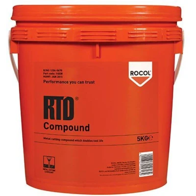General description ROCOL RTD® Compound is a soft paste lubricant designed for use with all metals, including hardened steels, titaniums, and nimonics. It is particularly effective in severe cutting operations, helping to prolong tool life and ensuring a smooth, clean-cut edge while easing cutting tasks. With over 60 years of market leadership, RTD® Compound is the preferred choice for reaming, tapping, and drilling in machine shops, tool-rooms, and maintenance departments. Technical specifications Weight: 5 kg Form: Soft paste Usage Suitable for all metals, including hardened steels, titaniums, and nimonics Ideal for reaming, tapping, and drilling operations