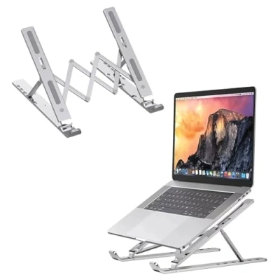 ERGONOMIC 6-LEVEL ADJUSTMENT: This adjustable laptop stand raises your laptop to eye level with a 6 solid height ergonomic choice to reduce neck and back strain, promoting better posture, and allowing for easy typing during extended work periods PREMIUM ALUMINIUM ALLOY BUILD: This laptop riser for desk made of a premium aluminum alloy-yet sturdy, light, and supportive of laptops of up to 15.6 inches-perfect option ensuring durability ENHANCED COOLING & AIRFLOW: This laptop holder highly ventilated with clear open areas to prevent overheating, improved heat dissipation, and cool running laptop performance PORTABLE & FOLDABLE DESIGN: This portable laptop stand slim, light, compact; folds flat to slip into bags or cases for comfortable use at home, in the office, or on the go WIDE COMPATIBILITY: This laptop stand for desk is suitable for different types of laptops, which are 10-15.6 inch fit. Most of MacBook Air/Pro laptops, Dell, HP, Acer, etc, as well as tablets and e-readers SLIM & STABLE DESIGN: This laptop desk stand is adjustable height and angle; slim profile; anti-slip pads and sturdy base keep your device secure while enhancing any workspace