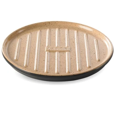 Round plancha with grill bars for more taste and less fat Ideal for preparing meat, fish, scampis and much more. Made of fireproof clay, high gloss black exterior, transparent natural glazed interior. Heat and temperature shock resistant up to over 900 °C, cut and scratch resistant Suitable for gas grills, charcoal grills, electric grills and also for the electric stove/oven