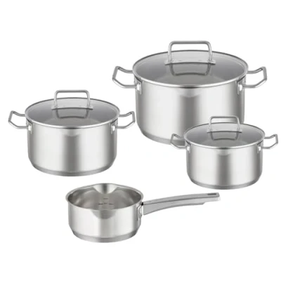 RÖSLE EXPERTISO 4-piece saucepan set, high-quality universal pot set with 3 saucepans including glass lids for searing meat and for cooking dumplings, vegetables and pasta as well as 1 saucepan for sauces and small dishes. Cookware for all who place great importance on the quality of their kitchen equipment Practical: with scale on the inside, the measuring of water or milk can be avoided with a measuring cup - encapsulated special base with 5 mm aluminium core for optimal heat conduction and distribution - straight handles for easy handling - the spouts allow for comfortable pouring and steam outlet High quality: made of 18/10 stainless steel with a special base with 5 mm aluminium core, optimal heat conduction and distribution – the satin surface gives the pot an elegant look – the elegant lid made of tempered glass provides a view of the pot fin All Rösle Expertiso pots are dishwasher safe and can be used on glass ceramic plates, electric, gas and induction cookers as well as in the oven Set consists of: cooking pot with glass lid diameter 16 cm, 20 cm, 24 cm and saucepan diameter 16 cm