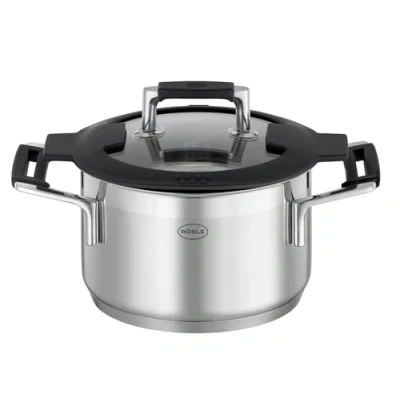 Rösle Silence Pro cooking pot: high-quality universal pot for searing meat and for cooking dumplings, vegetables and pasta - cookware for all who place great value on the quality of their kitchen equipment Practical: with scale on the inside, the measuring of water or milk can be avoided with a measuring cup - glass lid with viewing into the pot interior and all-round silicone closure for an accurate, tight support on the cooking pots - made of 18/10 stainless steel with a special base with 5 mm aluminium core ensures optimal heat conduction and distribution Tidy and clever: lid can be hung on the side for easy handling when cooking and on the dining table, which absorbs condensation. Silicone coating protects lid and side handles from excessive heating. Two sophisticated pouring options All Rösle Silence Pro pots are dishwasher safe and can be used on glass ceramic plates, electric, gas and induction cookers as well as in the oven. They are available individually or in a 4-piece or 5-piece pot set (item no. 91965 and 91966) Length 25.5 cm, width 17 cm, height 15.5 cm, diameter 16 cm, base diameter 15 cm, capacity 1.9 l, temperature resistant up to 160 °C, glass sodalime tempered, silicone smooth, black, stainless steel 18/10 with 2-tone polishing
