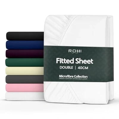 Rohi Double Fitted Sheet 100% Microfibre 16'' (40cm) Extra Deep with All Around Elastic Ultra Soft, Hypoallergenic & Durable Bed Bottom (White 137 x 190cm)