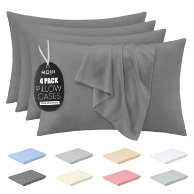 Rohi Microfibre Grey Pillowcases 4 Pack Ultra Soft & Smooth Pillow Covers with Envelope Closure Fade Resistant Breathable Cases Standard Size (50x75 cm)