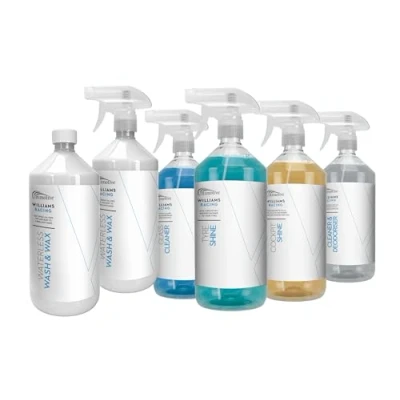Give your motor the professional car care treatment with the Williams Racing Car Cleaning Essentials Pack Contents 1 x Williams Glass Cleaner 1L, 1 x Upholstery Cleaner 1L, 1 x Cockpit Shine 1L, 1 x Tyre Shine 1L 2 x 1L Waterless wash and wax