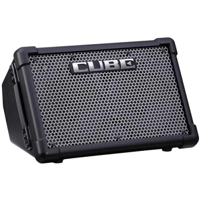 Innovative new Roland technology provides 50 watts of stereo power from eight AA-size batteries Selectable output power modes to optimize battery life for different performing situations (Max: 50 W/5 hours; Normal: 25 W/10 hours; Eco: 10 W/20 hours*) Portable, lightweight design (7.4 kg/16 lb. 5 oz.) with durable ABS injection-molded cabinet, plus a powerful, full-range stereo sound with dual 8-inch woofers and 2-inch tweeters Four independent channels support a wide range of mics, instruments, and audio devices, with two XLR inputs for dual vocal performances COSM tones for electric guitar, including Clean, Crunch, and Lead; preamp for acoustic guitar provides clean, natural sound Angled back for use as a stage monitor; mounting hole for use with optional ST-A95 Speaker Stand Stereo Line Out jacks for connecting to an external sound system when used as a stage monitor Stereo Link jacks to connect a second CUBE Street EX for broader sound coverage Easy recording into your iPhone/iPad via i-CUBE Link and free CUBE JAM app Optional CB-CS2 Carrying Case made with water-repellent material