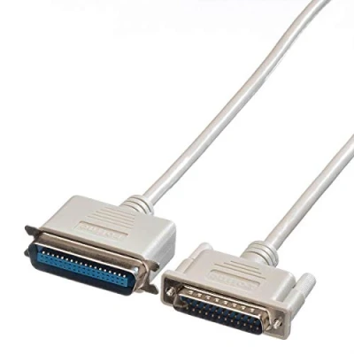 Cable with 25-pin D-sub plug and 36-pin Centronics plug, 25 wires Shielding cable, connected to the foil shield and both plugs Connector housing moulded with special plastic, thus optimal strain relief Bronze contacts with gold plating Hand locking screws