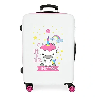 Suitcase 65 cm x 46 cm x 23 cm. It has a capacity of 56 litres and weighs 3.1 kg. Made of ABS, a rigid and lightweight material. Practical interior with two compartments, a zip pocket on one side and on the other side fastening rubbers. Four multi-directional swivel double wheels for comfortable driving, smooth rolling and effortless manoeuvrability. Side combination closure for safe travel and to protect your personal belongings.