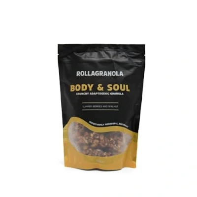 BODY & SOUL NOOTROPIC GRANOLA: This granola is stacked with ingredients aimed to target everything you need to be you. Focusing on boosting memory, mood, stamina, as well as reducing anxiety levels, Rollagranola’s Body & Soul works to give you a flavour-filled experience that serves you beyond the first bite. WELLBEING GRANOLA: To help you feel more you everyday. Our Body & Soul stack is jam-packed with our very special blend of 100% natural superfoods including maca root, ginkgo and ginseng plants which all work together to help you fuel your best self. BREAKFAST ANYTIME! This refreshing & punchy granola is designed for you to enjoy anywhere you like - at home, work, during your workout or even as a final bit of luxury before bed. Simply eat as a classic cereal with milk, or add your favourite protein yoghurt for a high protein snack or honey to sweeten. INGREDIENTS: Gluten Free Whole Grain Oats, Coconut Sugar, Walnuts 8%, Almonds, Flaked Coconut, Quinoa Crisp (puffed Quinoa), Sunflower Seeds, Brazil Nuts, Dates (dates, Rice Flour), Rape Seed Oil, Macadamia Nuts, Chia Seeds, Dried Berries 3% (blueberries, Freeze Dry Raspberries, Freeze Dry Blackberries), Creatine Powder, Maca Powder, Ginko Powder, Ginseng (panax) 0.3% HANDCRAFTED IN THE UK: Using only the finest 100% natural ingredients, our oat granola contains no refined sugar and is vegan and vegetarian friendly.