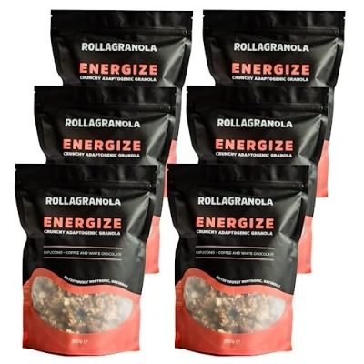 Rollagranola Energize Cappuccino Coffee & White Chocolate Oat Granola 6 Pack of 350g. Gluten Free All Natural Crunchy Adaptogenic Granola. Nutritiously Nootropic Naturally. Handcrafted In The UK