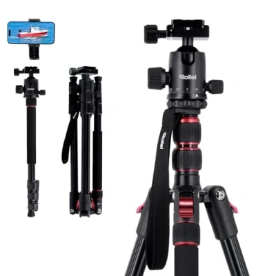 [Flexible Camera Stand Tripod] 360° rotatable ball head allows you to easily take photos from any angle. With the folding leg locks, this professional tripod can be easily adjusted from 44 cm to 180 cm to set the most suitable height, providing a variety of positioning options for creative shooting [Portable Tripod for Camera] Compact Traveler No.2 weighs 1,46 kg with a pack size of 44 cm and can easily fit into any backpack or luggage, a very portable camera tripod and ideal for travelling and outdoor photography [4-in-1 Tripod for Phone and Camera] The Rollei universal tripod can be easily converted into a monopod, and can also be used for macro photography or low-angle shooting with the 180° reversible ball head. The tripod is also equipped with a smartphone holder to provide photographers with the flexibility to switch between different devices [Stable Aluminum Tripod with Exchangeable Spikes] Rollei Camera Stand is made of roubst aluminum with a load capacity of up to 5 kg for reliable stability. With its mountable spikes, this tripod can be safely and stably holded even on slippery or soft surfaces such as grass, sand or snow [High compatibility] This tripod is compatible with cameras and devices with 1/4“-20 and 3/8” threaded holes, such as DSLR cameras, action cameras, camcorders, projectors, stabilizers, etc. In addition, each tripod leg is equipped with a 1/4" threaded hole and supports up to 4 devices on this tripod for simultaneous shooting.