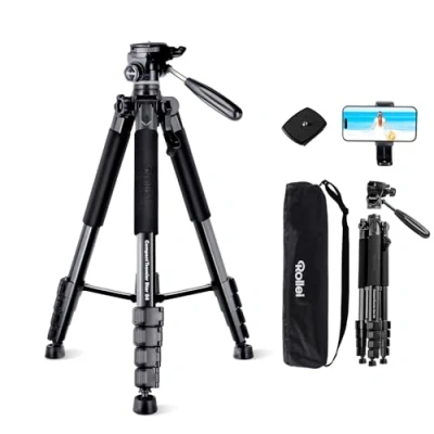 [Detachable Ball Head with Handle] The three-way ball head of the travel tripod supports 360° horizontal rotation for panoramic shooting, 180° tilt and 90° vertical shooting. You can rotate/tilt it flexibly with the handle to find the ideal angle of view and easily capture the best shooting moments [Compact & Portable Tripod] The camera tripod stand weighs only 1.4 kg with 51.5cm packsize. Whether in the trunk of your car, in your backpack or on your airplane hand luggage, this lightweight tripod always fits easily into your equipment, ideal for travel and outdoor shooting as well as long photo tours [Flexible Adjustable Tripod Height] With the foldable leg locks, this professional tripod can be easily adjusted between 49.5 cm and 188 cm to meet the needs of different shooting heights. So you don't have to bend down or resort to uncomfortable positions to get the perfect shot [Stable Aluminum Tripod] Rollei Star S4 Camera Stand is made of lightweight yet roubst aluminum with a load capacity of up to 5 kg for reliable stability. A hook on the bottom of the center column allows you to hang objects and provides more stability. The non-slip rubber feet prevent slipping or moving when shooting on soft ground, grass or sand [Wide Compatibility] The ball head of this Rollei tripod has a 1/4 inch screw that is compatible with all devices with 1/4 inch threaded holes such as DSLR cameras, action cameras, camcorders, projectors, webcams, stabilisers, etc. The included phone holder can rotate 360° and is compatible with all smartphones, ideal for live streaming, selfies, videos & time-lapse recordings etc.