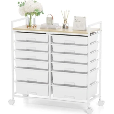Rolling Storage Cart with 12 Drawers, Wooden Tabletop Utility for Craft Storage, Art Supply & Home Office Organization, Teacher Wheels Classroom, School (White)