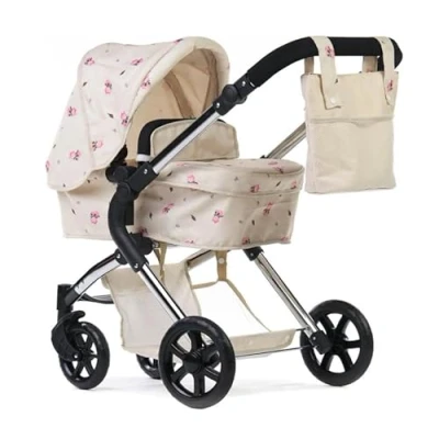 Roma Darcie Dolls Pram Cream 2in1 with Carrycot and Doll Pushchair Seat Unit, Adjustable Handle Height, Includes Changing Bag, Shopping Basket, Foldable, Pretty Flower Design, Suitable from 3 9 Years