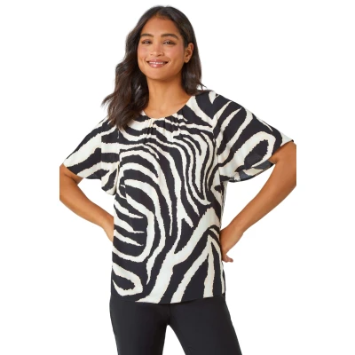 Roman Animal Print Pleat Detail Top for Women UK Ladies Spring Everyday Summer Holiday Round Neckline Comfy Short Sleeve Soft Woven Fabric Blouse Desk to Dinner Shirts Black Size 12