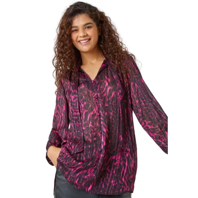 Animal Print Tie Neck Chiffon Top from Roman. Add some abstract print to your transitional wardrobe with this printed chiffon blouse. Cut from a smooth woven fabric this piece features a sophisticated high neckline with sweet tie detail and cosy full length sleeves finished with elasticated cuffs. It features a fully open button front, a unique abstract print and a soft subtle shimmer throughout. The perfect day to night style, simply swap your smart trousers for leather leggings and heels for an evening with friends!