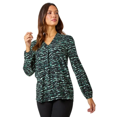 Wave Print Pleated Stretch Top from Roman. Make waves this season with this unique wave print top! Crafted from a comfortable stretch jersey fabric, this versatile piece is designed for both function and fashion. It features a flattering v-neckline and cosy full-length sleeves finished with elasticated cuffs. Pleat detailing ensures a flattering fit while the vibrant print makes a style statement. Wear with jeans and heels for dinner with friends or pair with tailored trousers for work!