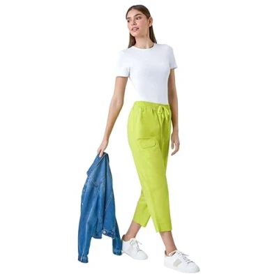 Roman Cotton Cropped Cargo Trousers for Women UK Ladies Spring Everyday Summer Holiday Elasticated Waistband Comfy Side Pockets Soft Woven Fabric Pants Daywear Bottoms Lime Size 12