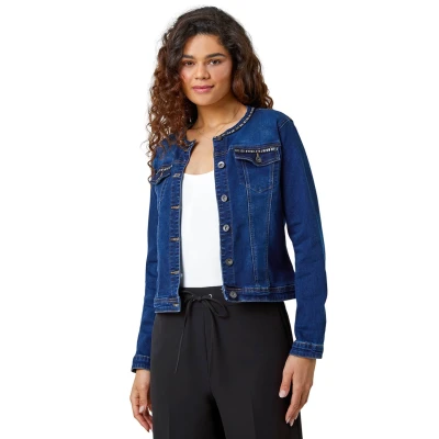 Secret SalesCollarless Tape Stretch Denim Jacket from Roman. Looking to take your denim jacket collection to the next level? This collarless version puts a new spin on a classic! It is trimmed with striped suede ribbon and metallic threads across the round neckline and two patch pockets. This long sleeve jacket has a fully button through fastening with secure metal buttons. The acid wash finish is so trendy for everyday dressing and looks great paired with wide leg trousers and trainers.