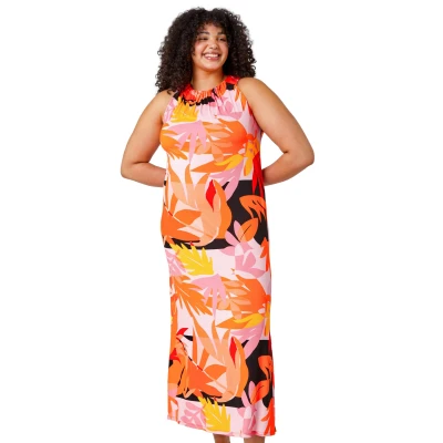 Curve Tropical Stretch Jersey Maxi Dress from Roman. Make a bold statement wearing this tropical print Curve maxi dress. Designed in a classic sleeveless silhouette for easy wearing, this dress has a flattering ruched round neckline and a loose floaty fit. A small keyhole detail with button fastening at the back makes this comfy style so easy to wear with its thick straps and stretch jersey material. We recommend wearing this dress with a strappy sandals for a sensational seasonal style and easy Summer holiday dressing.