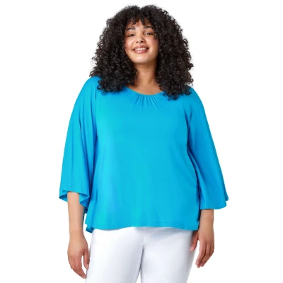 Curve Stretch Jersey Cape Sleeve Top from Roman. Embody Summer class in this smart casual staple top. This Curve blouse is detailed with a relaxed batwing silhouette, 3/4 length sleeves and pleat detailing at the neck. This stretch jersey fabric is easy to pull on and go throughout the season with its loose cape sleeve creating a floaty Summer fit. We recommend pairing this piece with some cropped trousers and sandals for a stunning Spring style or dressing it up for work with trousers and courts.