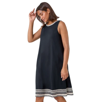 Roman Embroidered Trim Stretch Jersey Shift Dress for Women UK Ladies Spring Everyday Summer Holiday Round Neckline Comfy Sleeveless Soft Knee Length Frock Daywear Gowns Black Size 18