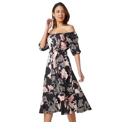 Floral Linen Blend Bardot Midi Dress from Roman. Get Summer ready with this suitcase staple; contrast floral midi dress. Crafted from a light linen blend fabric, this woven dress is breathable and cool ideal for the warm weather. Adorned in a striking floral print this dress features a self-tie fabric belt and sweet, short puff sleeves. A comfortable elasticated neckline can be worn on or off the shoulders dependant on occasion or mood. This dress is finished with button detail and a fun frill hem. Pair with heeled wedges and a denim jackey for effortless Summer style!