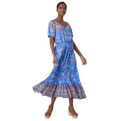 Floral Print Keyhole Maxi Dress from Roman. Its the season for boho vibes, and this dress is an absolute must have for your Spring Summer wardrobe! Made from a light and breathable woven fabric, this floral print dress has a gathered round neck, complete with a keyhole cut out and simple tie detail. With a fit and flare shape and elasticated waist this maxi dress compliments the figure perfectly. For effortless casual style, team with a denim jackets and sandals!