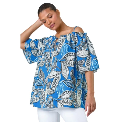 Leaf Print Cold Shoulder Bardot Top from Roman. Tap into the vibrant energy of the Summer season with this leaf print bardot top. This stunning woven top features a flattering cold shoulder neckline and short flared sleeves for a playful touch. With skinny adjustable straps and tie detail at the front, this top offers a customisable fit and adds a charming detail. The keyhole cutout with beaded detail adds a touch of sophistication. Finished with a bold floral print, this top is perfect for warm weather styling. Pair it with your favourite crops and simple sandals for a chic and effortless holiday look.