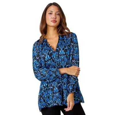 Roman Metallic Print Chiffon Blouse for Women UK Ladies Autumn Everyday Winter Holiday V Neckline Comfy Long Sleeve Soft Frill Cuff Party Top Button Detail Shirts Blue Size 12