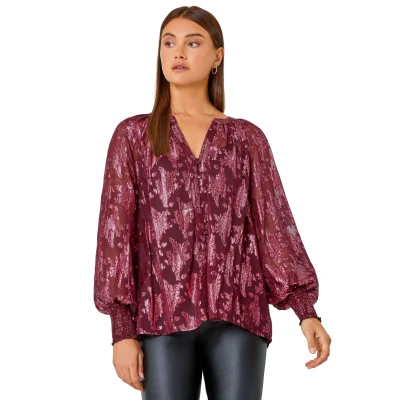 Roman Originals Abstract Metallic Print Blouse for Women UK Ladies Everyday Autumn Winter Notch Neckline Comfy Soft Evening Vacation Work Party Night Out Wine Size 12