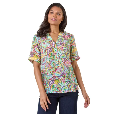 Abstract Print Button Detail Top from Roman. Get your Summer wardrobe ready with this colourful woven top! This tunic number is adorned in an all-over abstract spot print and has been cut to a relaxed silhouette, featuring a classic v-neckline and short sleeves. Updating your Spring wardrobe has never been easier with this bold printed top, ideal for the warmer weather with three functional buttons at the front. Team this top with cropped trousers and sandals to complete your holiday look.