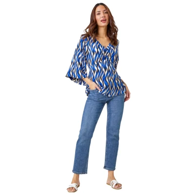 Roman Originals Abstract Print Ruched Tunic Top for Women UK Ladies Everyday Holiday Spring Summer V Neckline Comfy Soft Evening Vacation Work Party Blue Size 12