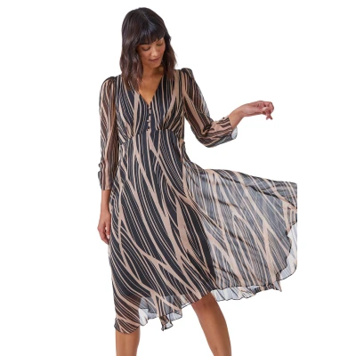 Abstract Print Wrap Midi Dress from Roman. This abstract print chiffon dress is bound to become a wardrobe staple this season. With its neutral colour palette, 3/4 length sheer sleeves with ruched detail at the cuffs this dress has a feminine v neckline. A flattering hanky hem and delicate button detail at the bust finish it off beautifully. Add heels and a leather jacket for after work drinks!
