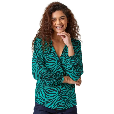Animal Print Tie Neck Stretch Top from Roman. Take a walk on the wild side with this vibrant zebra print blouse. Bring some fun into the Autumn Winter with this colourful piece, featuring a feminine v-neckline, long sleeves with elasticated cuffs and a feminine tie neck detail. Cut from a comfortable stretch jersey fabric, this pull over piece is a great way to add a little pazazz to your Autumnal daytime wardrobe. Pair with leather trousers and chunky boots for a quirky seasonal style or dress it down with denim jeans.