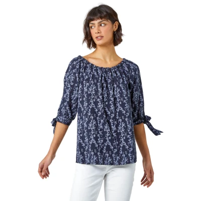 Ditsy Floral Print Bardot Top from Roman. Perfect prints for your Spring wardrobe, this lush floral print top is perfect for your seasonal wardrobe. With a comfortable bardot neckline and 3/4 sleeves finished with tie details, this top is made from lightweight material making it easy to wear all season. Wear on holiday with your shorts and sandals or dress up for any Summer occasion with some cropped trousers and wedges.