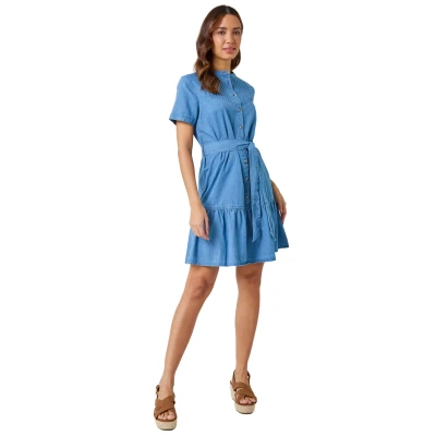 Roman Originals Belted Cotton Denim Frill Hem Dress for Women UK Ladies Everyday Holiday Spring Summer Collarless Shirt Neckline Comfy Soft Evening Vacation Work Party Light Size 20