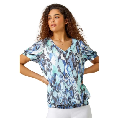 Secret SalesAnimal Burnout Print Blouson Stretch Top from Roman. Combine some abstract, animal prints with comfy classic shapes with this printed, burnout top. Cut from a stretch jersey, printed fabric this piece features a v neckline and sweet, short sleeves with slight volume. A thick blouson banded hemline provides a comfortable and flattering fit. Pair with mom jeans and sandals for an on trend, relaxed look!