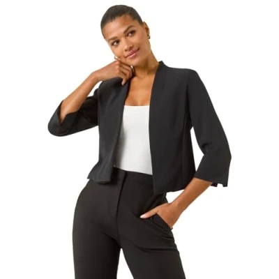 Roman Originals Bolero Jacket for Women UK Ladies Shrug Tailored Rochette Suit Blazer Formal Wedding Guests Crepe Crop Stretch Smart Cover Up Office Work Slim Edge to Black Size 14