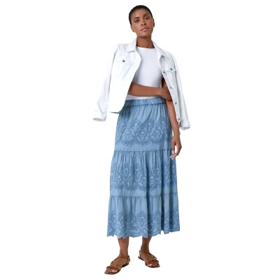 Roman Originals Broderie Tiered Stretch Midi Skirt for Women UK Ladies Everyday Holiday Spring Summer Comfy Soft Evening Vacation Work Party Denim Size 20