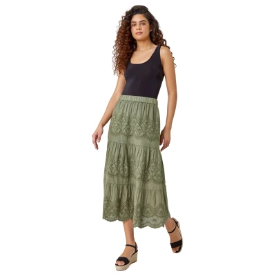 Roman Originals Broderie Tiered Stretch Midi Skirt for Women UK Ladies Everyday Holiday Spring Summer Comfy Soft Evening Vacation Work Party Khaki Size 14