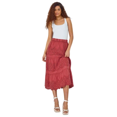 Roman Originals Broderie Tiered Stretch Midi Skirt for Women UK Ladies Everyday Holiday Spring Summer Comfy Soft Evening Vacation Work Party Rust Size 16
