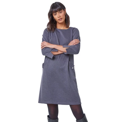 Roman Originals Button Detail Stretch Shift Dress for Women UK Ladies Autumn Everyday Winter Holiday Round Neckline Comfy 3/4 Sleeve Soft Frock Jersey Gowns Dark Grey Size 10