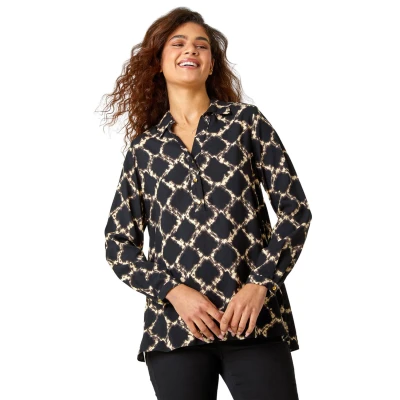 Chain Print Collared Top from Roman. This statement-making chain print shirt is a real winner for your Autumn wardrobe. Featuring a classic v-neckline with smart shirt collar, this top has long sleeves with cuffs and a striking all-over chain print, adding a touch of sophistication. The half button placket and collar provide a polished finish that's perfect for smart casual occasions. Pair with faux leather leggings and heels for an effortless desk to dinner ensemble or add some sparkling accessories for the party season!