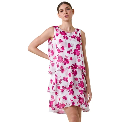 Floral Print Tiered Layer Dress from Roman. Flaunt your florals this Summer in a fabulous frill number! Perfect for the warmer weather season, this floral print tiered dress is a must have. Cut from a flowing chiffon fabric that features a metallic fibre print, this luxurious dress is designed with a classic round neckline and a captivating, tiered silhouette. A soft inner lining keeps you covered whilst a sleeveless silhouette adds a playful twist, ideal for layering. Wear with a strappy heel, bolero and clutch bag for a sensational evening occasion outfit.