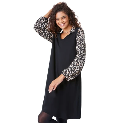 Contrast Leopard Print Swing Dress from Roman. This 2 in 1 swing dress style uses the effect of a contrasting animal print sleeve and shirt collar, making it perfect for the transitional season. It's feminine v neckline showcases the printed collar perfectly and the full length sleeves are adorned in a fierce animal print, finished with smart shirt cuffs. Pair with tights and boots for a cute every day look that’s perfect for work or play!
